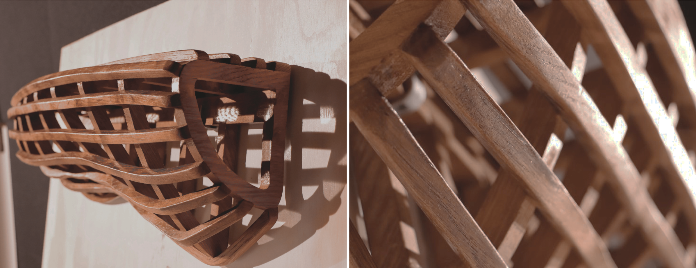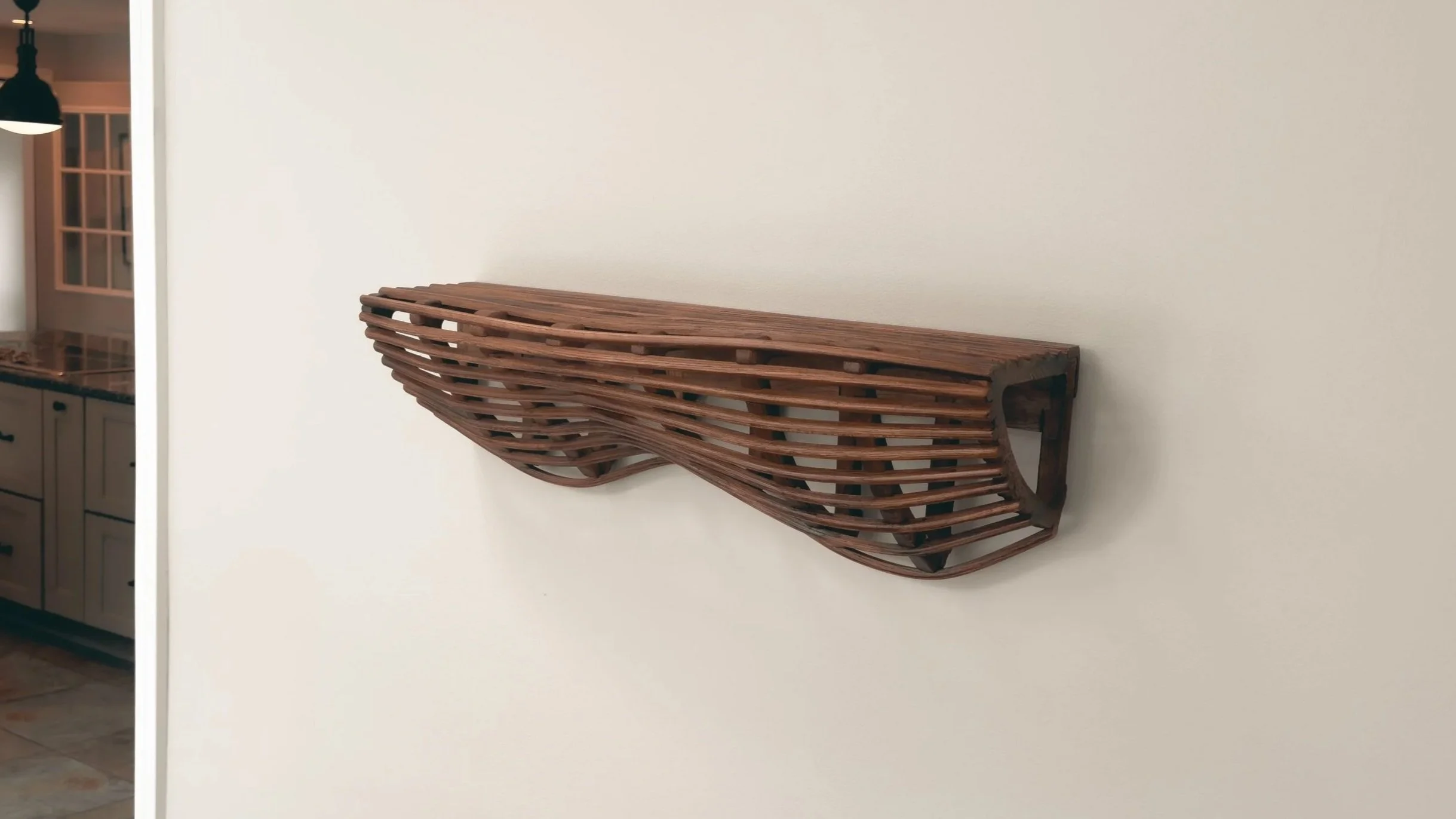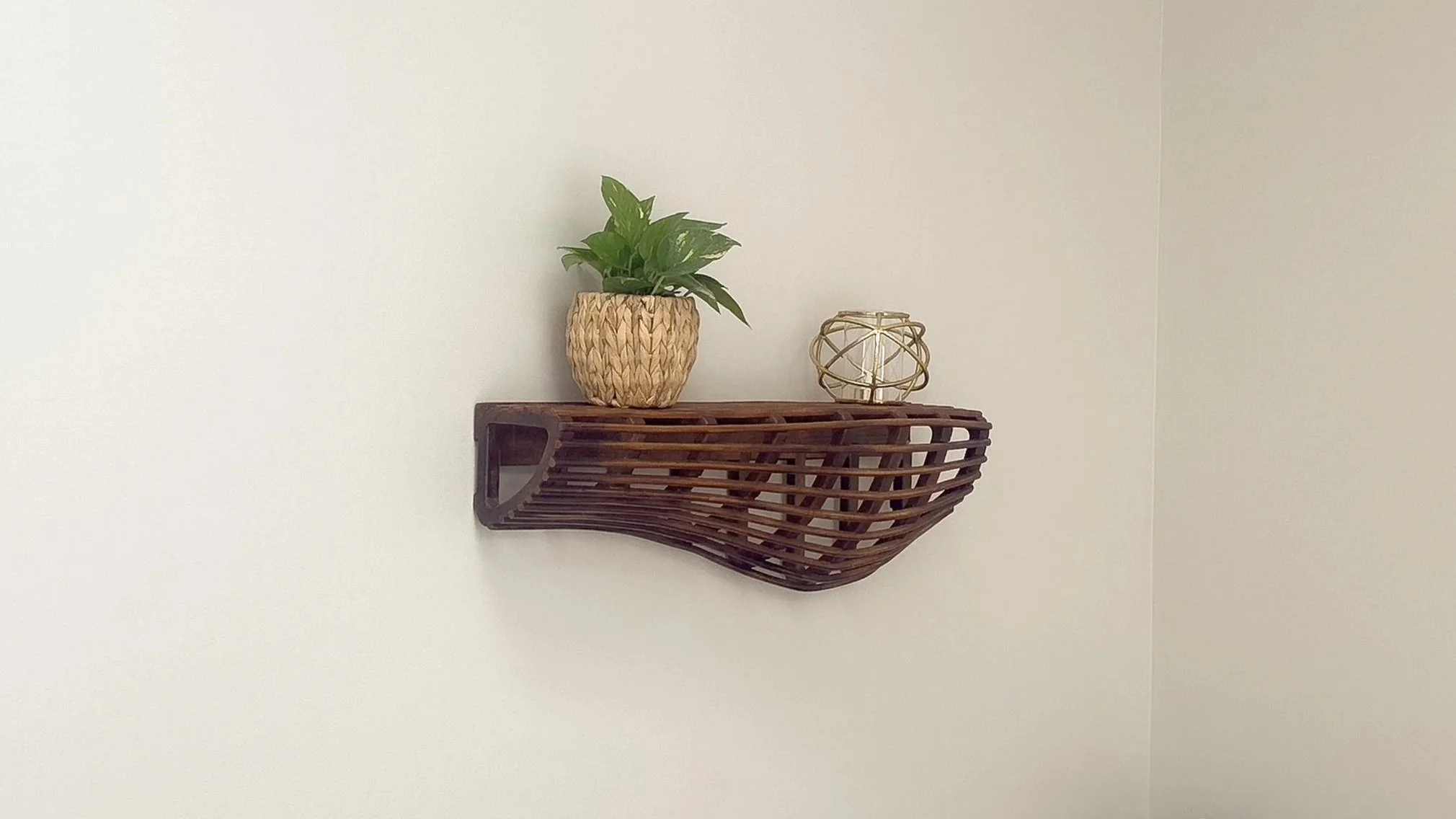 Design a series of floating shelves inspired by ancient woodworking techniques used by shipwrights.